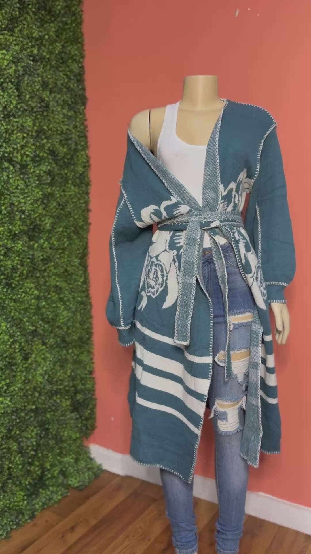 Wrap yourself in effortless elegance with this teal statement cardigan designed to turn everyday outfits into a moment. Featuring a rich teal hue with bold cream floral detailing, this longline cardigan blends softness, structure, and style in all the right ways.